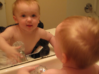 Olivia has made it her mission to stand on her own and tries over and over. She's getting better at standing for longer periods. She loves walking with parent's fingers. She has what David calls "a Kung Fu grip". I swear she could break my fingers off!